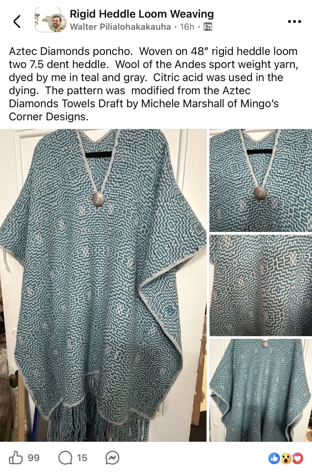 This is the Aztec Diamonds Towels pattern, adapted for a much wider rigid heddle loom, a larger fiber, and an amazing project! When I saw this posted, I had to reach out to the weaver, Walter Fosdick, to learn more. That led to a video in which Walter and I have a weaverly chat about his project.1